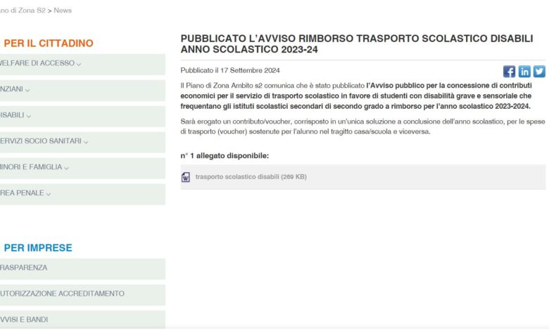 Home/ATTUALITA'/Contributo per il trasporto di studenti con disabilità, pubblicato il bando [VIDEO] ATTUALITA' Contributo per il trasporto di studenti con disabilità, pubblicato il bando [VIDEO] Mario D’Amato Invia un'email Settembre 17, 2024Ultimi aggiornamenti: Settembre 17, 20240 16 Meno di un minuto Facebook X LinkedIn WhatsApp Telegram Condividi via Email Stampa Mario D’Amato Invia un'email Settembre 17, 2024Ultimi aggiornamenti: Settembre 17, 20240 16 Meno di un minuto Facebook X LinkedIn WhatsApp Telegram Condividi via Email Stampa Condividi Facebook X LinkedIn WhatsApp Telegram Condividi via Email Stampa