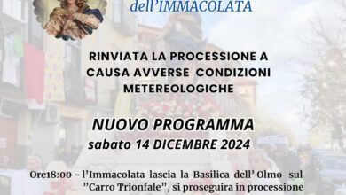 La processione in onore di Santa Maria Immacolata, che avrebbe dovuto essere svolta ieri, è stata rinviata per le avverse…