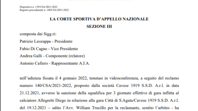 Cavese, l’esito del ricorso per Diego Allegretti
